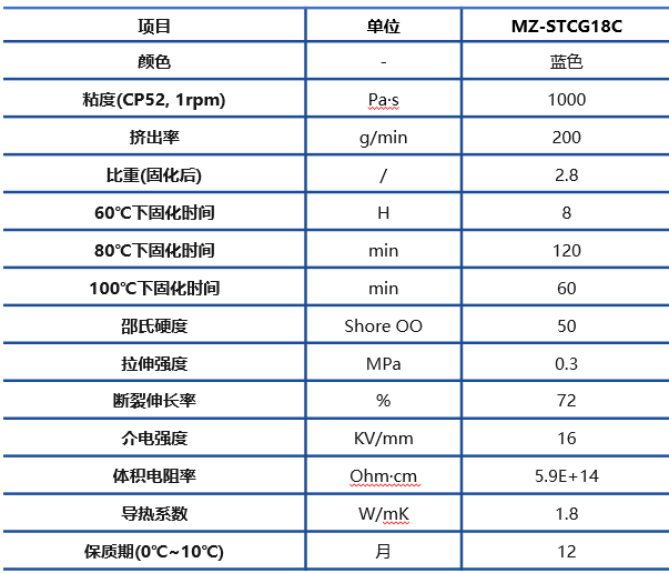 MZ-STCG18C可重工导热凝胶是单组分、热固化有机硅导热凝胶,具有良好的可重工性能。它是一种不可流动的膏状材料,在热管理应用中,可压到低至50微米的厚度。这种材料固化后形成弹性散热垫片,具有一定的拉伸强度和伸长率,在重工时较易剥离无残留。